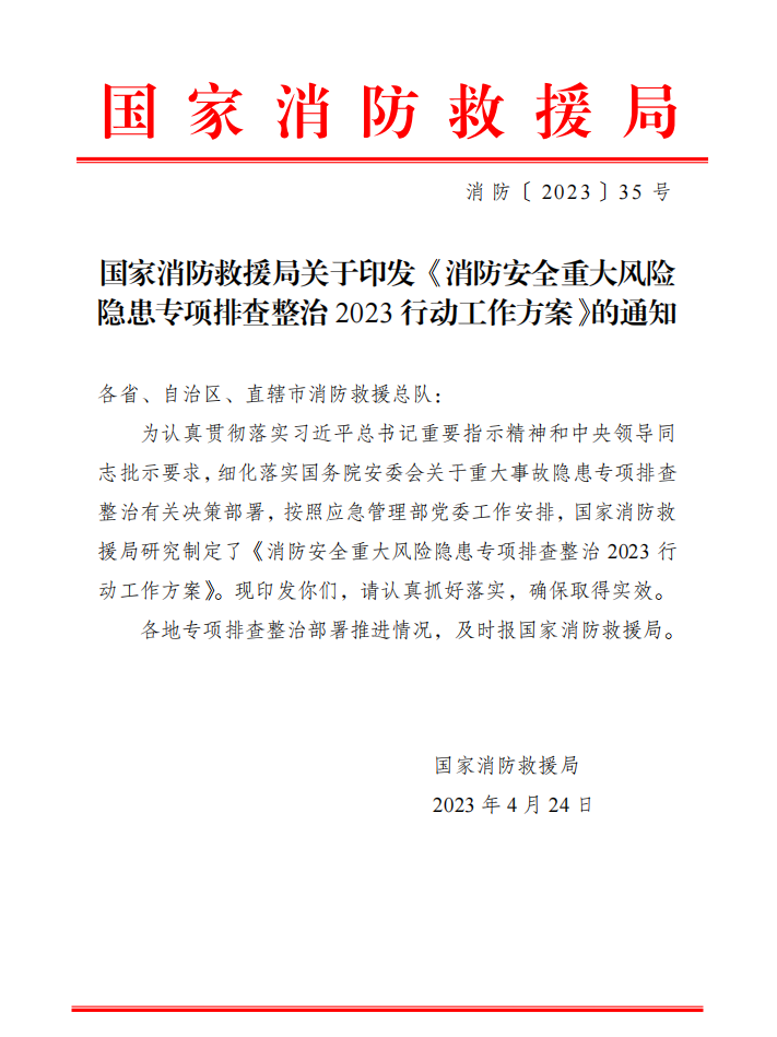 首页 首页 / 行业新闻 / 国家消防救援局关于印发《消防安全重大风险隐患专项排查整治 2023 行动工作方案》的通知